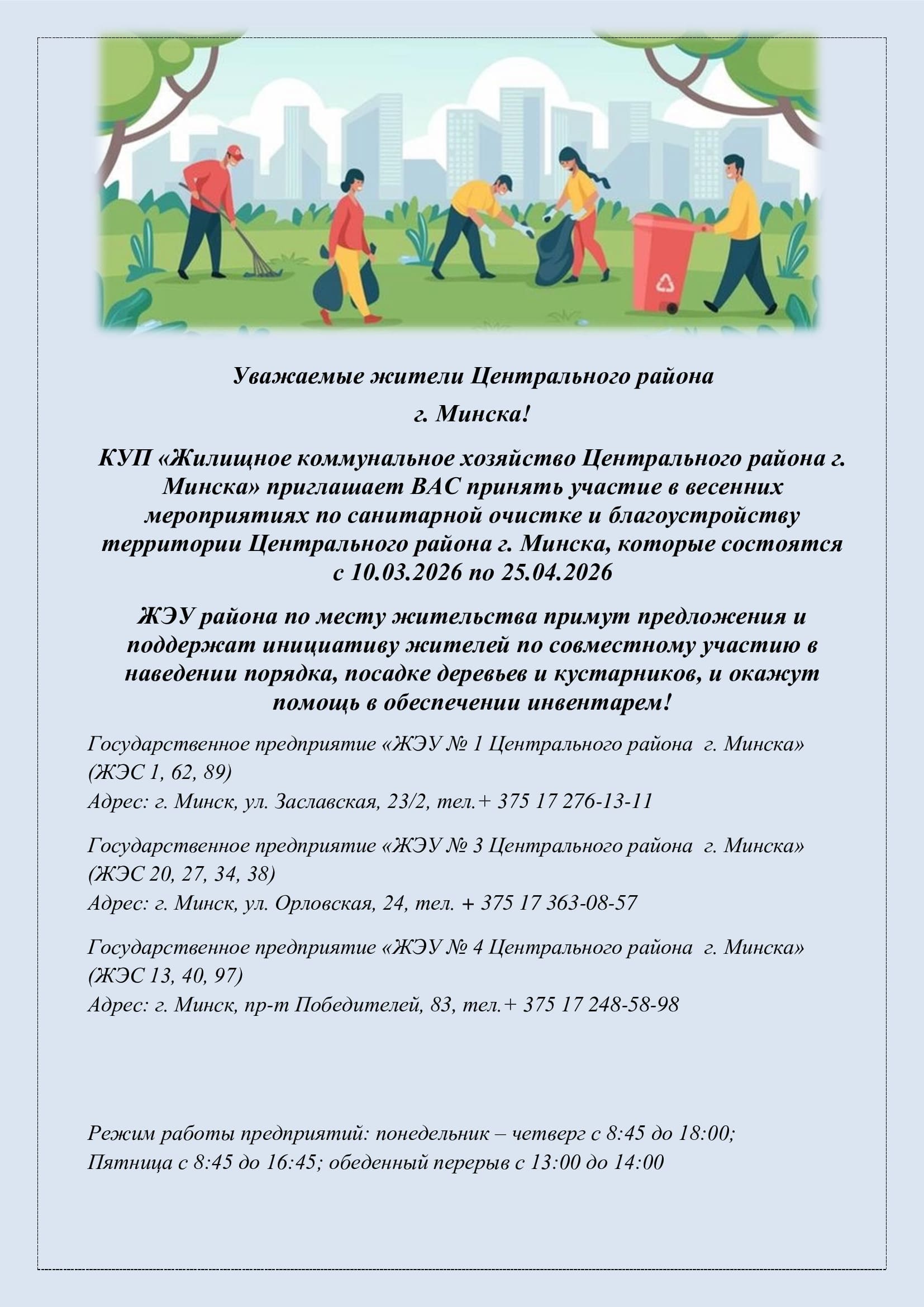 | 28.03.2026 | ЖЭУ № 1 | ул. Заславская 31, 33, 35 | выгребание зеленой зоны, подметание усовершенствованного покрытия, очистка приямков, очистка усовершенствованного покрытия от сорной травы, погрузка мусора на автотранспорт вручную. | Зазулова Н.И. +37525 916-35-15 |